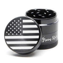 Compatible with Dry Herbs 🌿 Green Star Novelty Small Grinder Built-In Pollen Screen Anodized Aluminum Kief Compartment Ergonomic Grip 4-Part Design 1.5” Diameter Pollen Catcher Magnetic Top Lid Original Art Designs Included Scraper Tool Diamond Shaped Teeth Compact & Travel-Friendly