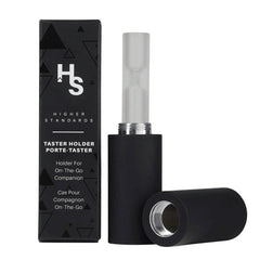 The Higher Standards Taster Holder is a premium pocket-sized companion that accommodates your on-the-go lifestyle. Designed to perfectly fit the Higher Standards Glass Taster or a pre-rolled joint/blunt, the holder's aluminum-cased interior traps odors and protects from damage. Crafted with a rubberized finish, the Taster Holder provides a comfortable grip and optimal portability.