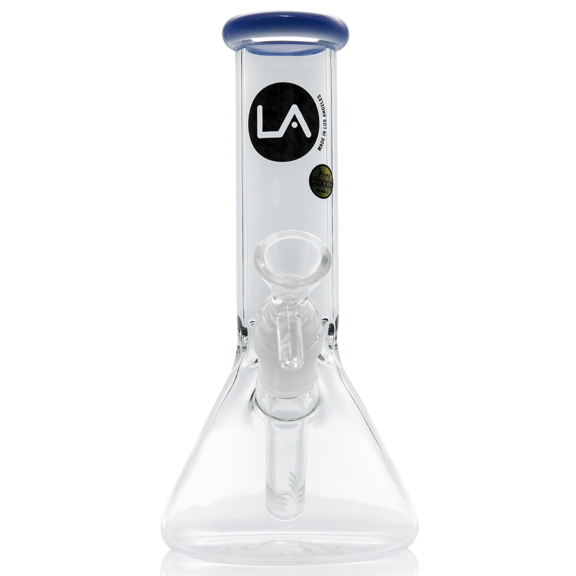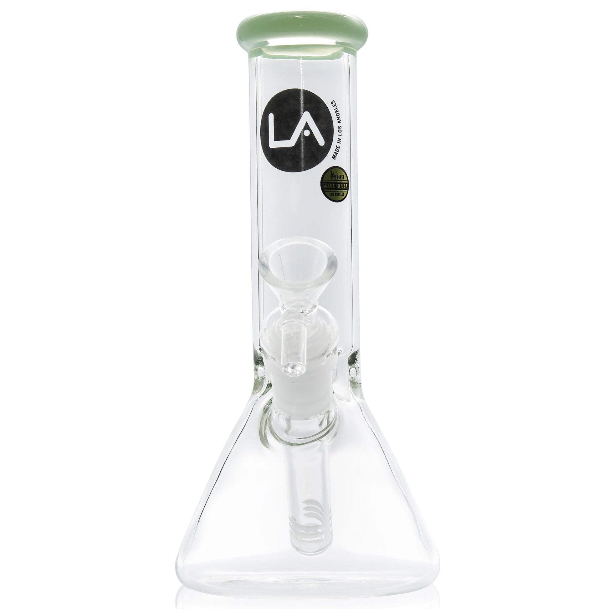 Looking for a heavy-hitting bong that is light on the wallet? Well, look no further because the LA Pipes 8†Color Accented Mini Beaker Bong offers both with a color accented mouthpiece to help this bong shine in your collection. This simple yet stylish beaker pumps out filtered smoke through the 6-slit removable diffuser downstem which houses the included 14mm glass bowl piece (style varies). Just above the beaker base, a triple-pinch ice catcher provides you with space to stack up ice cubes within the neck for colder, smoother draws. The recognized LA Pipes Decal on the neck shows others that you are smoking glass made in the USA. Get everything you need for an outstanding bong sesh with the LA Pipes Color Accented Mini Beaker Bong!