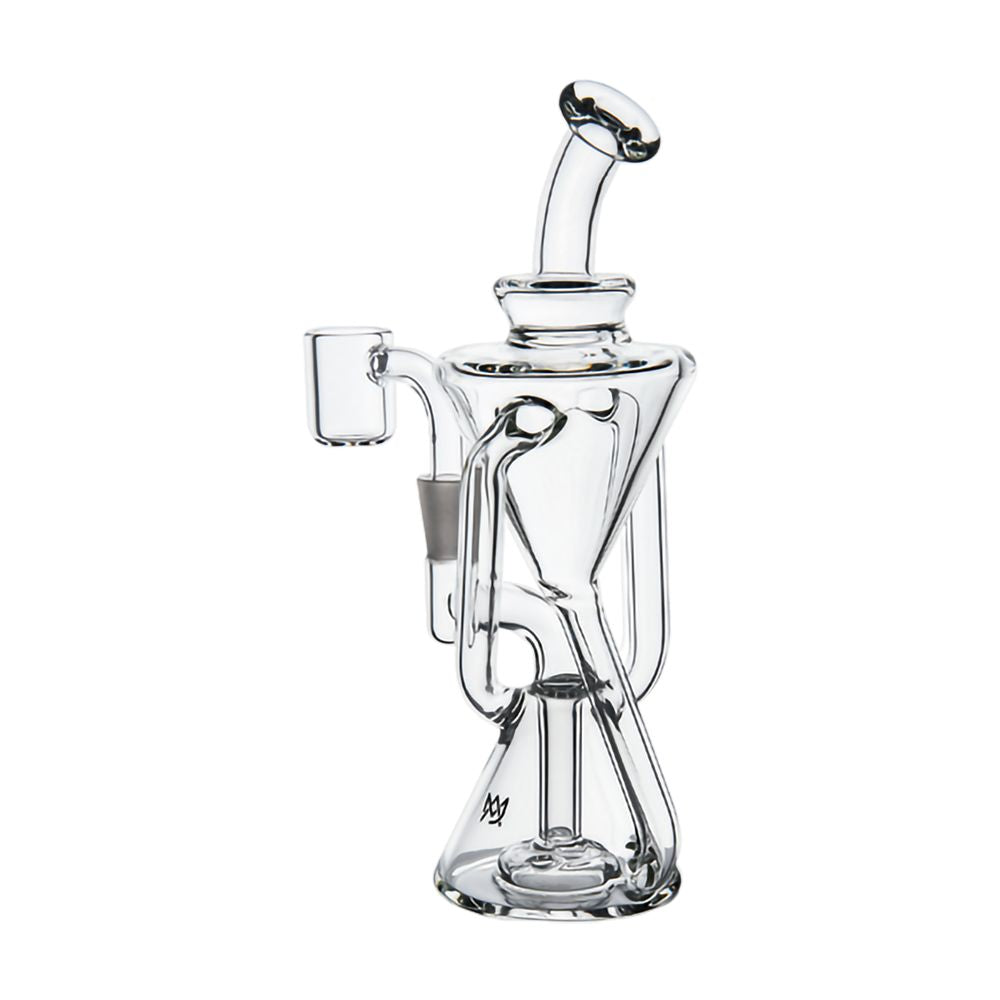 Take your dabbing experience to the next level with the MJ Arsenal Time Turner Dab Rig Set. This compact rig, crafted from clear borosilicate glass, boasts an innovative double uptake recycler system for efficient cooling and filtration. The stemless joint connection leads vapors into a 4-hole percolator at the base of the first chamber, followed by rapid cycling through the rig's side exterior tubes. The unique conical chambers, evocative of an hourglass, give this mini rig its name. The box set contains a standard flat top 10mm male quartz banger, a stainless steel dab tool, and a directional carb cap for optimal concentrate vaporization.