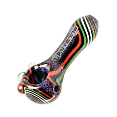 This Cosmic Journey Dichro Spoon Pipe is made from high-quality borosilicate glass. This stellar pipe features a zig-zagging stripe of brilliant sparkly color like stars in a futuristic galaxy. This compact hand pipe measures just under 4" inches long.